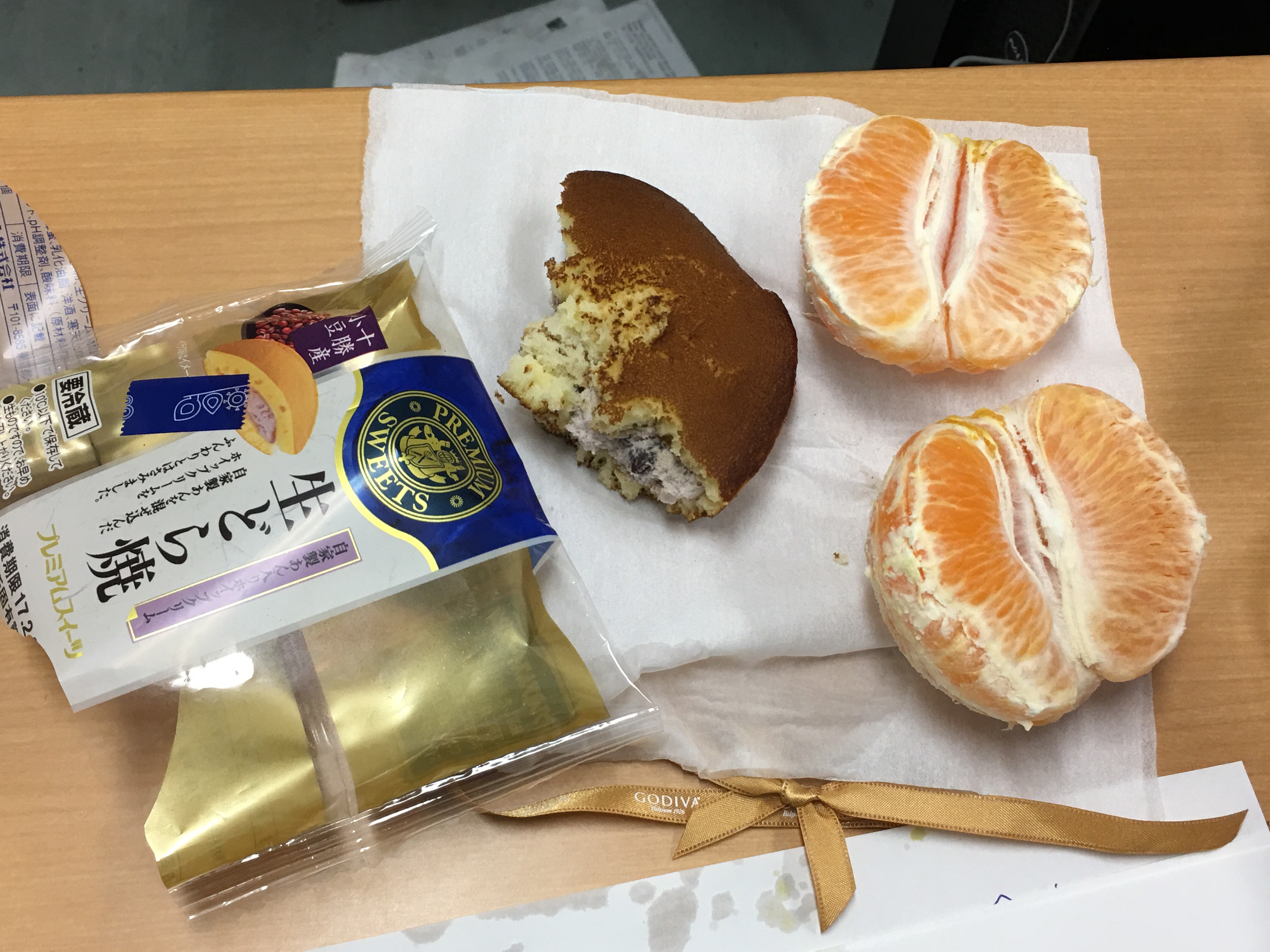 フルーツとどら焼き。いずれも私にとっては差し入れ。ありがたくいただく。