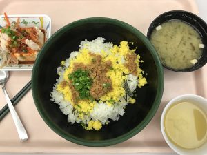 比内地鶏のそぼろ丼という名前だった。これら全部でエネルギー733Kcal、塩分5.0g、赤2.3、緑0.1、黄6.7とか。