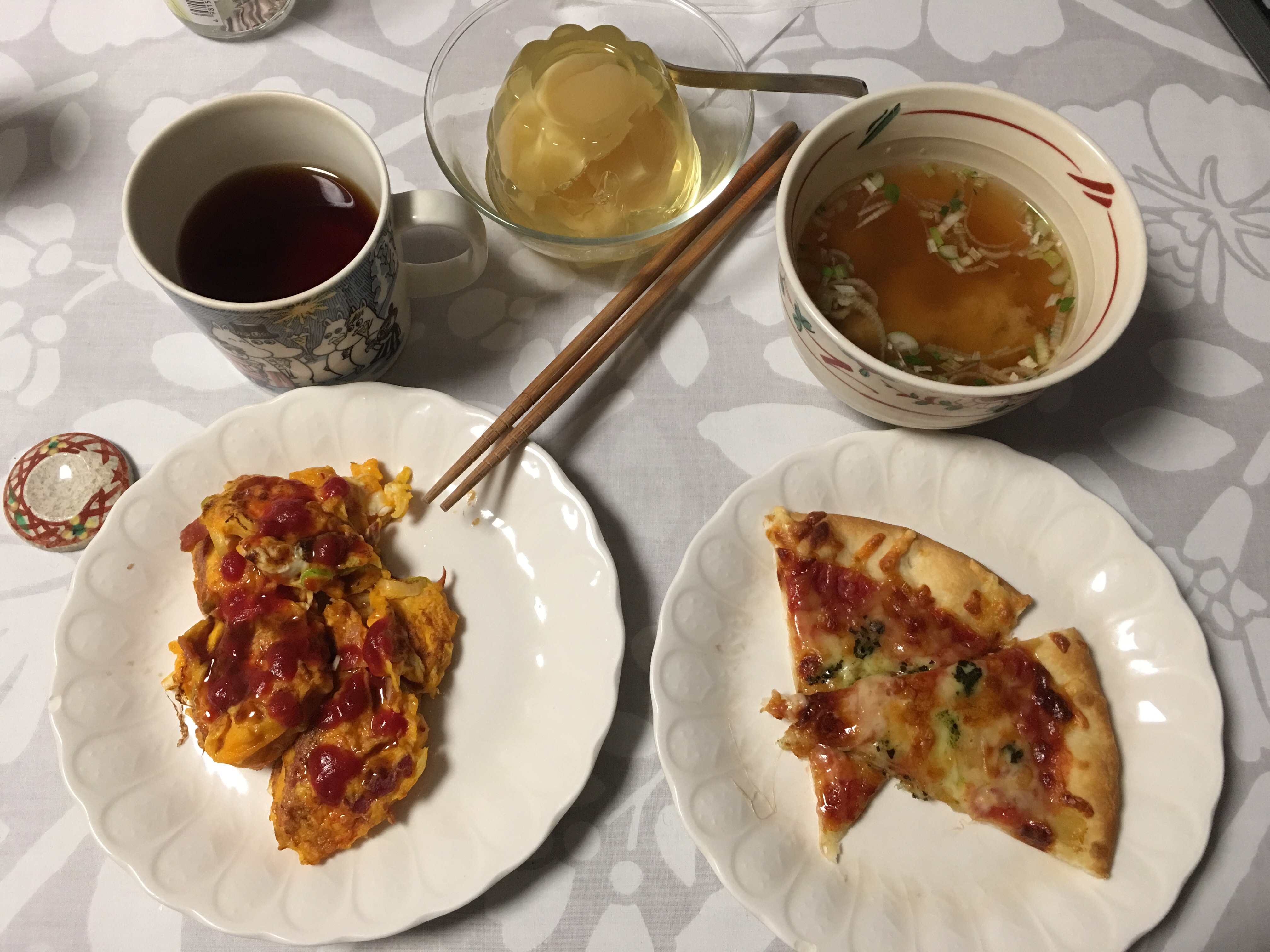 朝ごはん。オムレツとゼリーとお味噌汁は定番。ピザが珍しい。