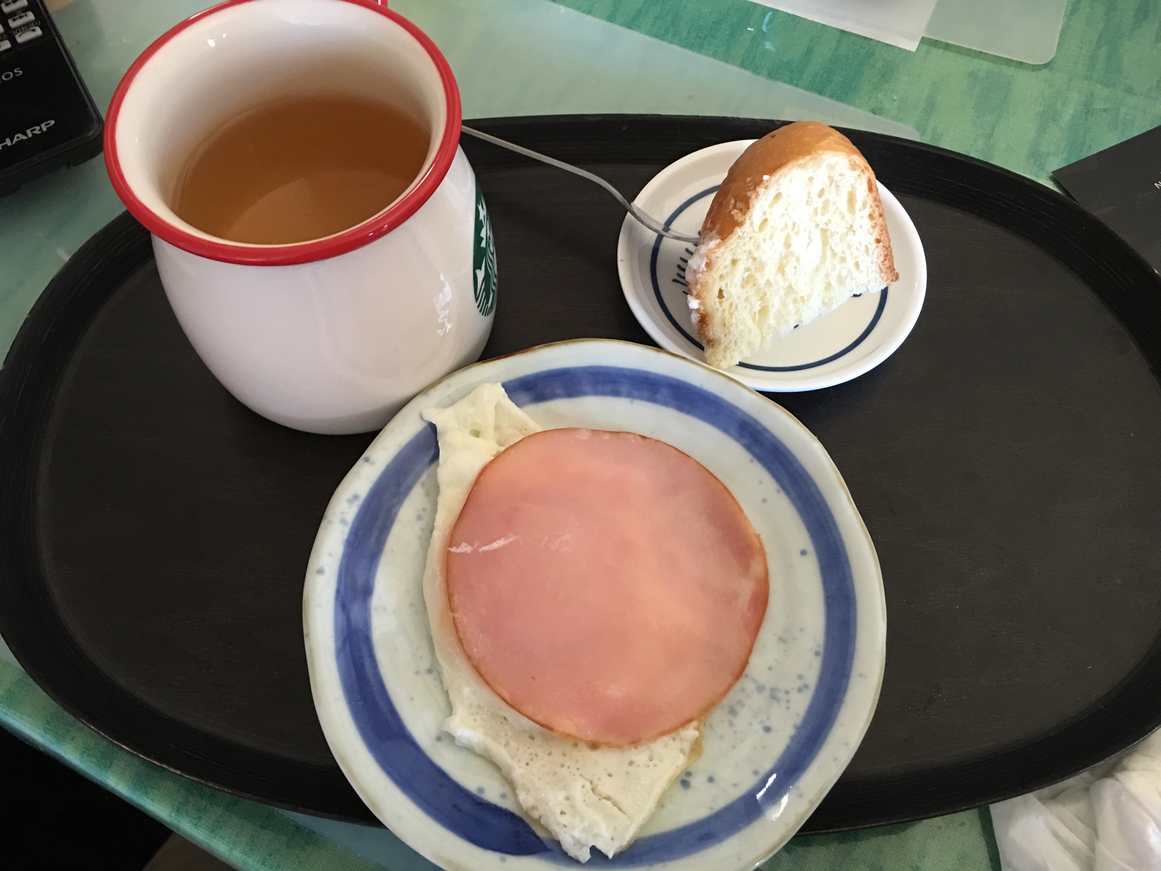 ハムエッグと昨日に駅ナカのパン屋さんで買って来たパンの8分の1ほど。